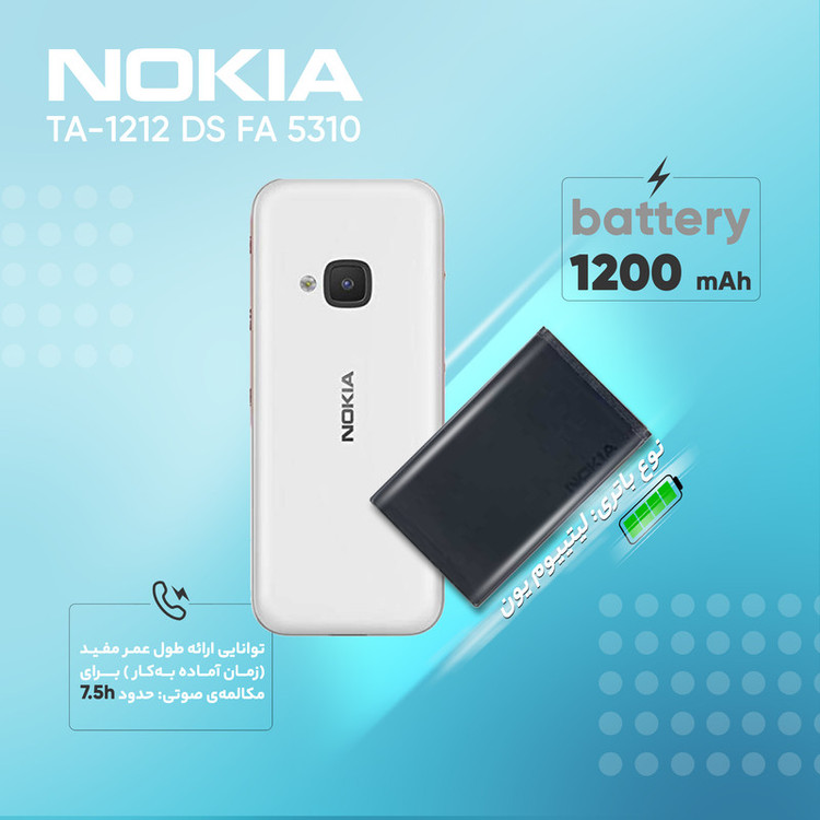گوشی موبایل مدل 5310 محصولی از برند «نوکیا» است که در اواسط مارس سال 2020 معرفی شد. این محصول از طراحی کلاسیک بهره میبرد و برای کاربرانی طراحی و تولید شده است که انتظار زیادی از گوشیهای موبایل خود ندارند. مطمئناً کاربران گوشیهای ساده و ارزانقیمتی چون نوکیا 5310، تقاضای زیاد و دور از ذهنی از گوشی خود ندارند؛ زیرا اصلیترین توقع این افراد از تلفن همراهشان، برقراری تماس و فرستادن پیامک به بهترین شکل ممکن است. نوکیا در طراحی 5310، صفحهکلیدی قرار داده است که تایپ و ارسال پیامک با آن بسیار آسان خواهد بود. همچنین این محصول طراحی جمعوجوری دارد و حدود 70 گرم وزن دارد. نوکیا، این مدل را به نمایشگری 2.4 اینچی مجهز کرده که از نوع LCD بوده و در ساخت آن از فناوری TFT بهره گرفته شده است. این نمایشگر با توجه به ابعادش، تراکم پیکسلی 167 پیکسل بر هر اینچ را به تصویر میکشد. مانند بسیاری از گوشیهای کلاسیک دیگر، نوکیا 5310 از یک دوربین با کیفیت VGA بهره میبرد و برای آن دوربین سلفی در نظر گرفته نشده است. وظیفهی تأمین انرژی این مجموعه امکانات در 5310، به باتری لیتیومیونی با ظرفیت 1200 میلیآمپرساعت سپرده شده است. این گوشی به صفحهکلید با زبان فارسی مجهز شده است.